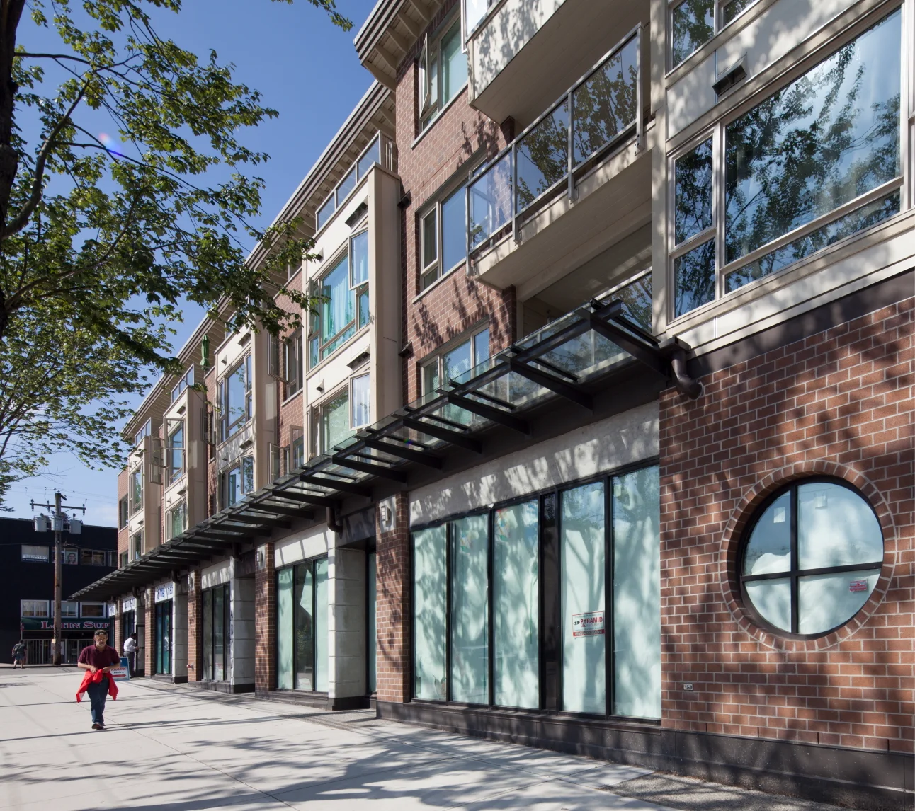 Situated near the lively commercial hub of Commercial Drive and Broadway, yet backing onto an established single-family neighborhood, this mixed use development was designed to increase the residential and commercial density on this major street, while still respecting the character of the surrounding single-family residential community. The project includes street level commercial uses along Commercial Drive, and three levels of condominium units above the ground floor. The main residential entry is separately located around the corner on East 13th Ave, with an angled recessed lobby element that figuratively still provides exposure to Commercial. The retail frontage is clearly expressed by the rhythm of glazed storefront and brick pillars under a continuous glass-and-steel canopy.